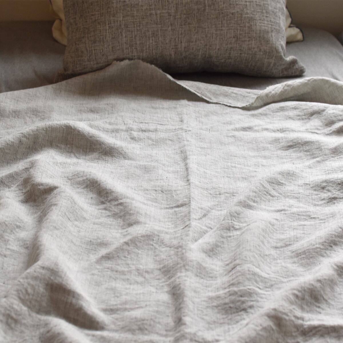 日本製のリネン枕カバーは、近江で織られた100%リネン生地を使用しており、サイズは幅45cm×長さ90cm。封筒式でサイズの調整が利く丁度いいサイズ感です。