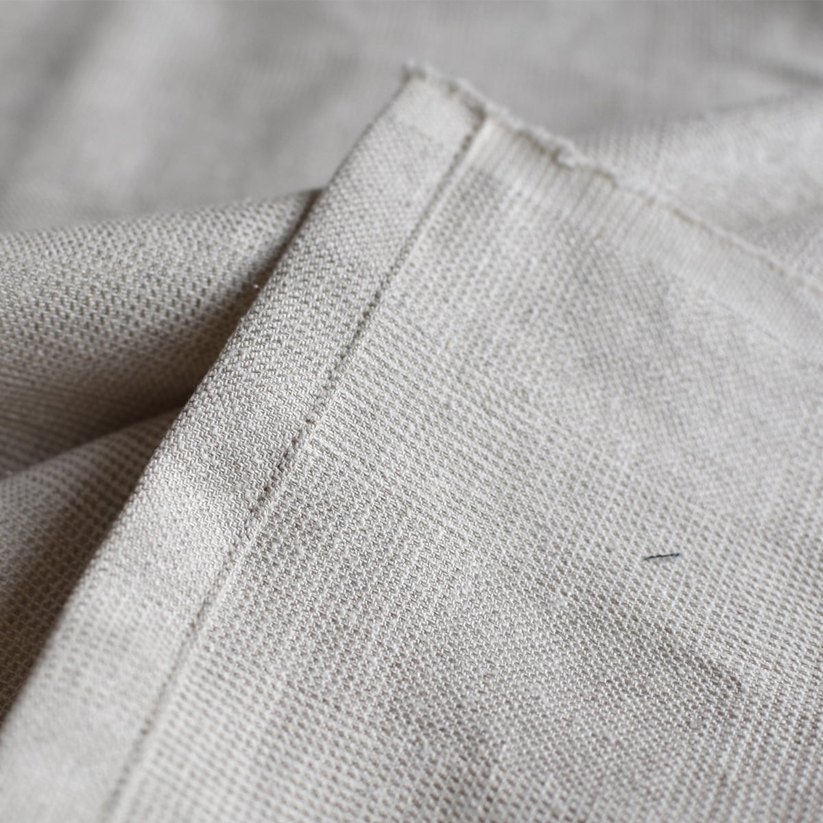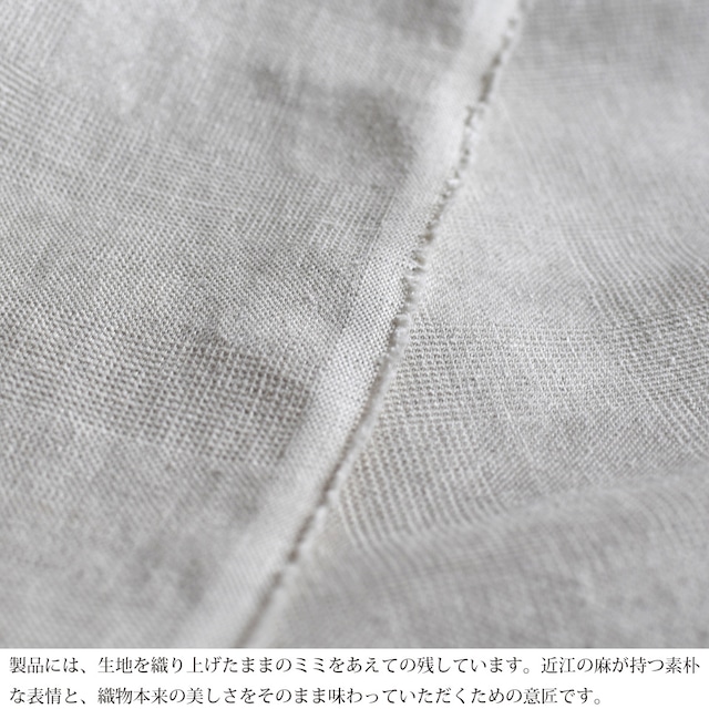 ミミをカットせずそのまま意匠として表現しており、近江の麻ならではの素朴な美しさと上品さを楽しむことができます。麻織物本来の魅力を感じ続けるデザインです。